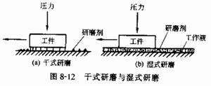 1.干研磨 研磨时只需在研具表面涂以少量的润滑附加剂。如图8-12a所示。砂粒在研磨过程中基本固定在研具上,它的磨削作用以滑动磨削为主。这种方法生产率不高,但可达到很高的加工精度和较小的表面粗糙度值(Ra0.02~0.01μm)。