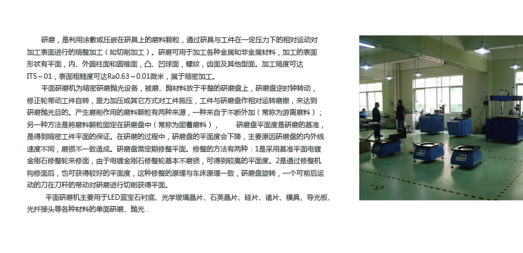 广泛用于光学晶体玻璃、光纤、模具、导光板、阀片、五金零部件,液压密封件、LED蓝宝石,陶瓷,不锈钢等各种材料的单面研磨及镜面抛光。